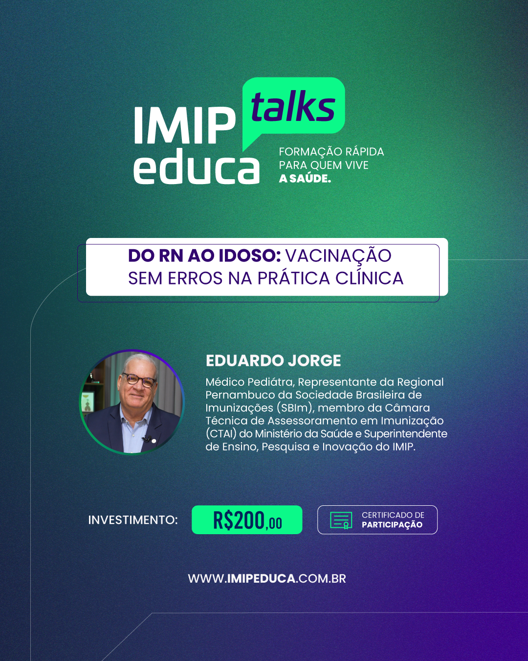 Neste IMIP Educa Talks, ele vai conduzir o tema do RN ao idoso com casos clínicos e debate, entregando clareza para decisões rápidas e orientação sem ruído, do consultório ao ambiente hospitalar.